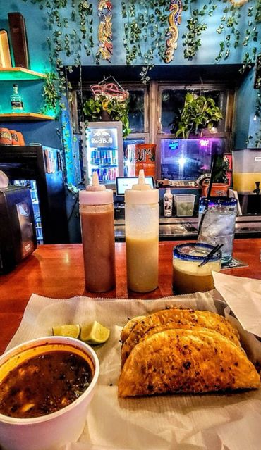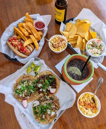 Bacon-wrapped hot dog, served with sautéed onions, mustard, Mayo, and ketchup (topping option: crushed flaming hot Cheetos) served with papas.