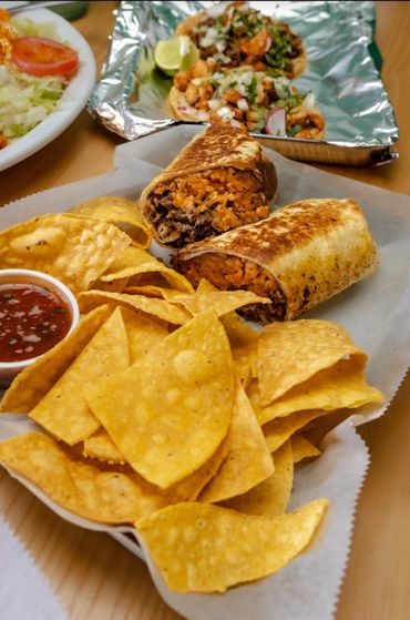 Filled with rice, queso, beans, and your choice of protein. Served with chips and salsa.