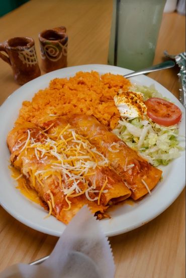 Filled with chicken and shredded cheese. Topped with red enchilada sauce. Served with rice.